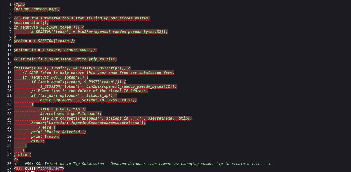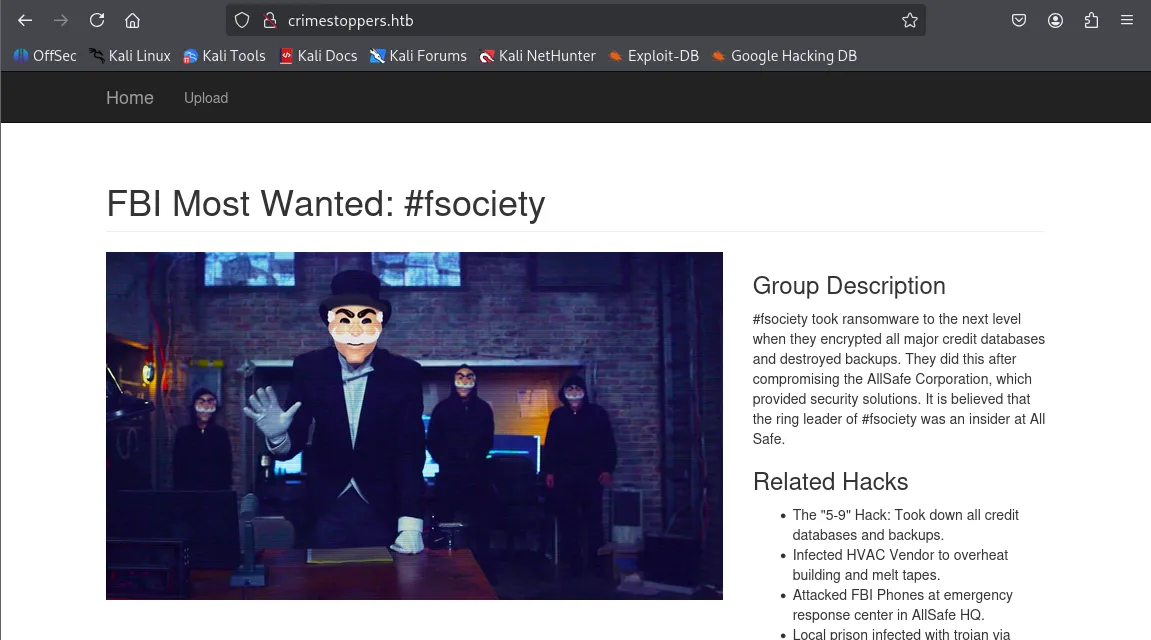 На сайті ми бачимо головних підозрюваних, опис групи та пов’язані з ними злами. Якщо ми переглянемо вихідний код головної сторінки, то не знайдемо нічого цікавого. Перейдемо в розділ Upload і спробуємо надіслати Tip (пораду). На виході отримаємо якесь секретне ім’я та саму пораду.