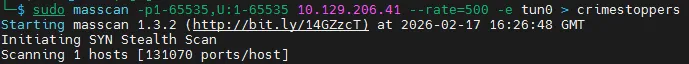 sudo masscan -p1-65535,U:1-65535 10.129.206.41 --rate=500 -e tun0 > crimestoppers