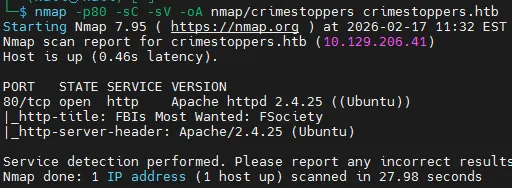 nmap -p80 -sC -sV -oA nmap/crimestoppers crimestoppers.htb