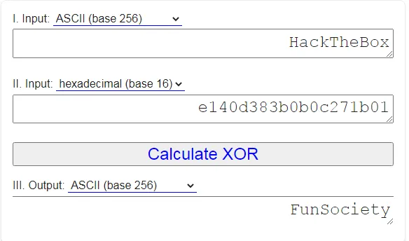 Секретна фраза формується зі слова HackTheBox, байтів E140D383B0B0C271B01 та інструкції XOR. Давайте скористаємося вебутилітами для декодування секретної фрази.