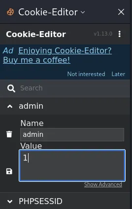 У запиті видно, що є cookie admin, яке дорівнює 0. Давайте змінимо це значення на 1 за допомогою плагіна cookie-editor і оновимо сторінку.