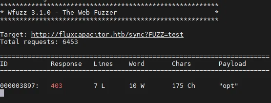 wfuzz -c -w /usr/share/seclists/Discovery/Web-Content/burp-parameter-names.txt "http://fluxcapaсitor.htb/sync?FUZZ=test"