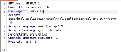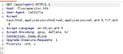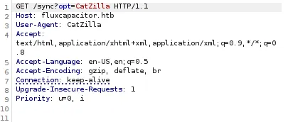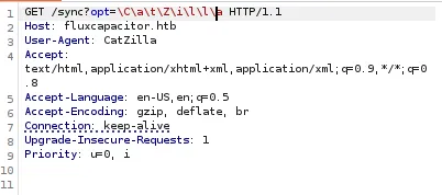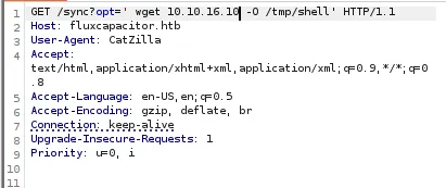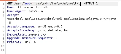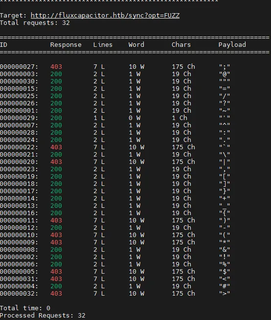wfuzz -c -w /usr/share/seclists/Fuzzing/special-chars.txt -H "User-Agent: CatZilla" "http://fluxcapacitor.htb/sync?opt=FUZZ"