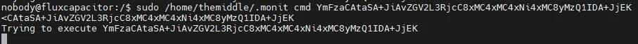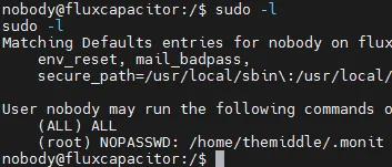What is the full path to the file that the nobody user can run as root with sudo - /home/themiddle/.monit