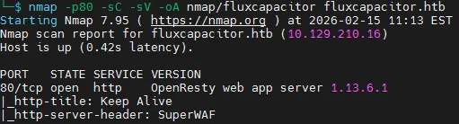 nmap -p80 -sC -sV -oA nmap/fluxcapacitor fluxcapacitor.htb