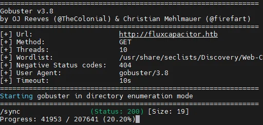 gobuster dir -u http://fluxcapacitor.htb -w /usr/share/seclists/Discovery/Web-Content/DirBuster-2007_directory-list-lowercase-2.3-medium.txt