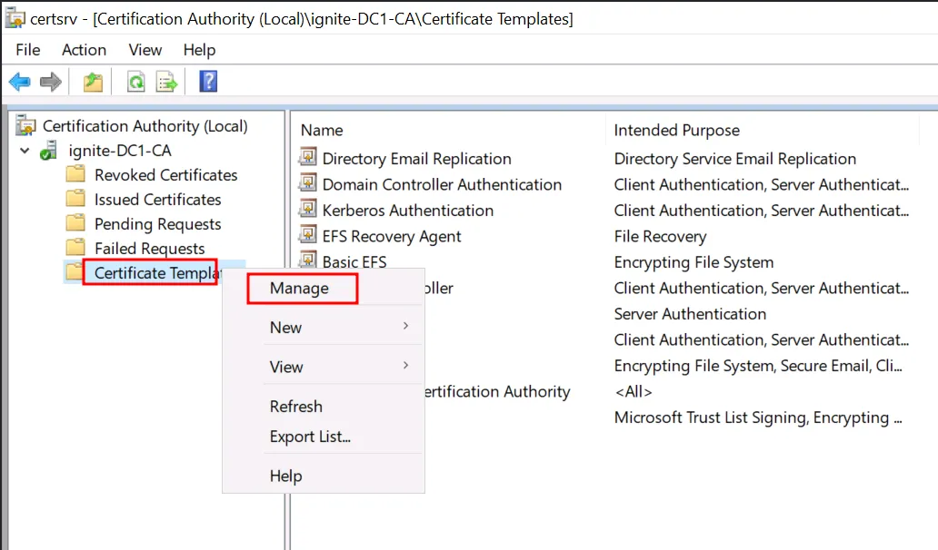 Розгорніть дерево вашого CA → Правою кнопкою миші на Certificate Templates → Manage.