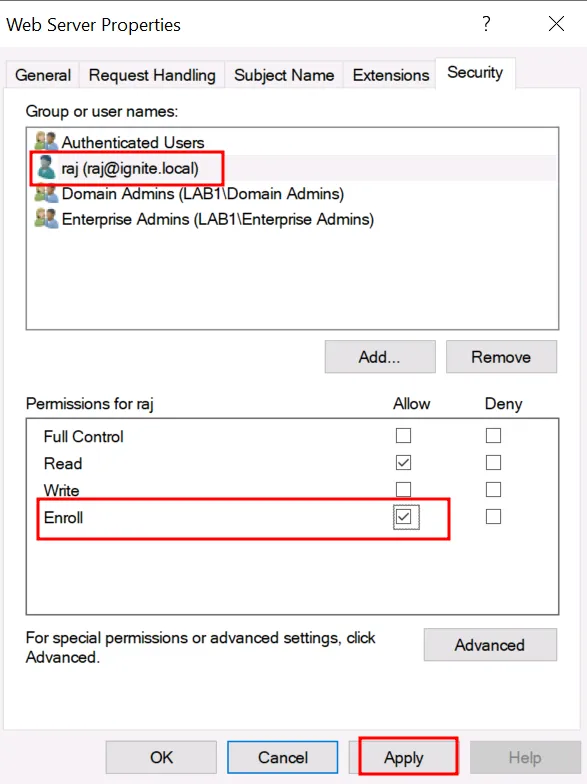 Перед експлуатацією підтвердьте, що шаблон Web Server увімкнено і ваш користувач (у нашому випадку raj) має права на реєстрацію (Enroll):