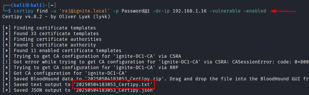 certipy find -u 'raj@ignite.local' -p Password@1 -dc-ip 192.168.1.16 -vulnerable -enabled