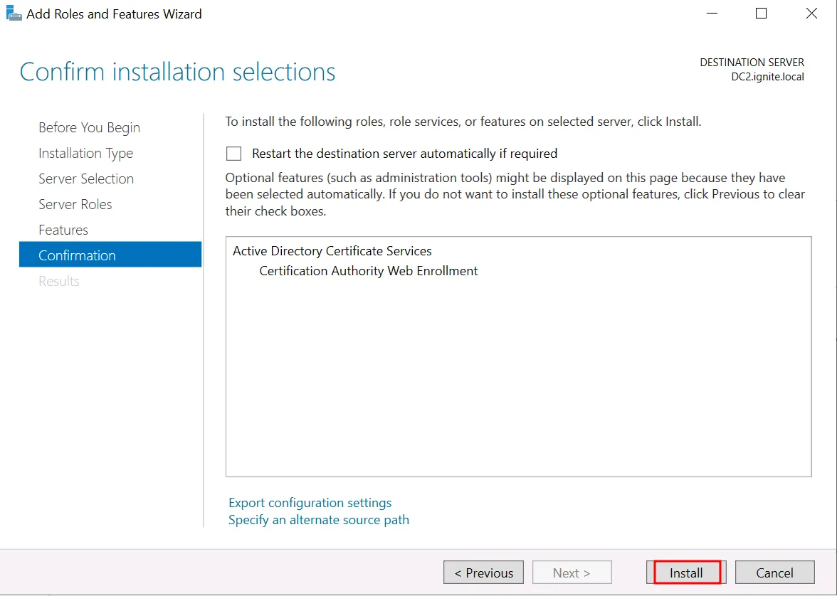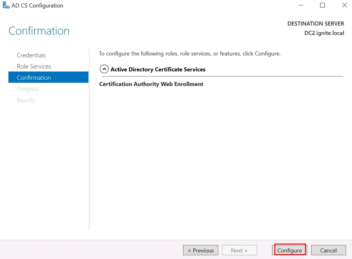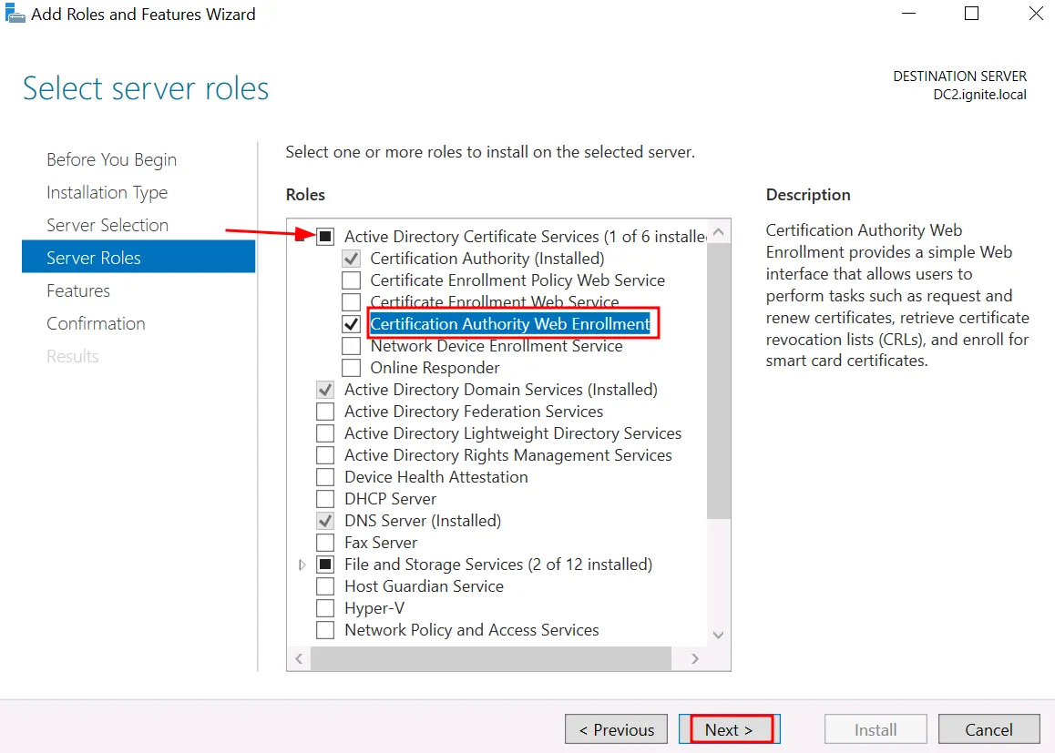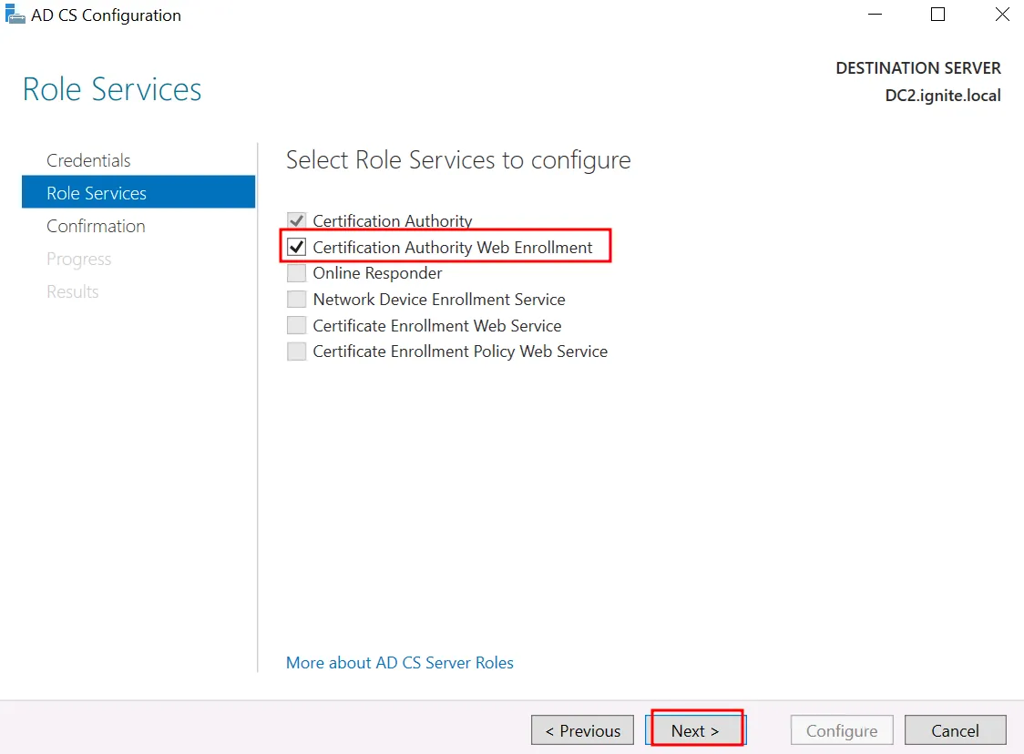 Перед початком атаки переконайтеся, що на DC2 (цільовий сервер) встановлено ADCS з увімкненою роллю Web Enrollment. Це критично, оскільки ESC8 зловживає саме HTTP-інтерфейсом /certsrv.