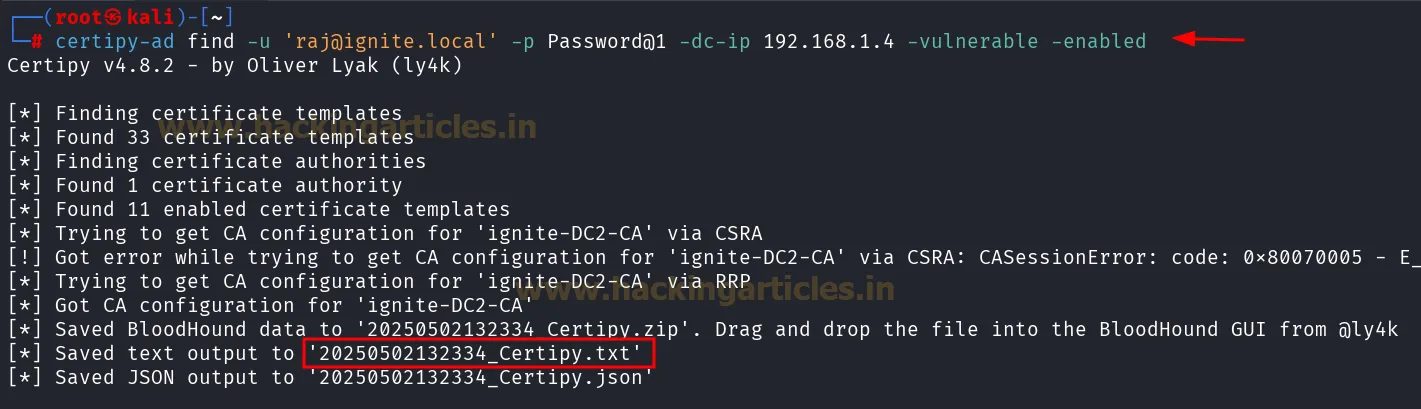 Маючи облікові дані звичайного користувача домену (raj@ignite.local), скористайтеся Certipy для пошуку шаблонів, які дозволяють зловживання: