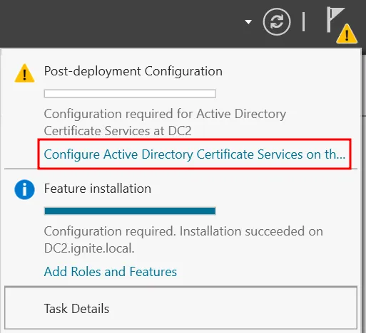 Після завершення встановлення в Server Manager з’явиться жовтий прапорець.
