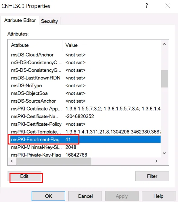 Крок 14: Усе ще в ADSI Edit → CN=ESC9 → Properties