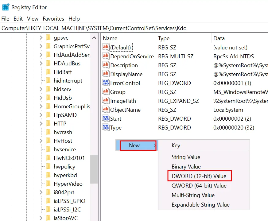 - Перейдіть до:ComputerHKEY_LOCAL_MACHINESYSTEMCurrentControlSetServiceskdc