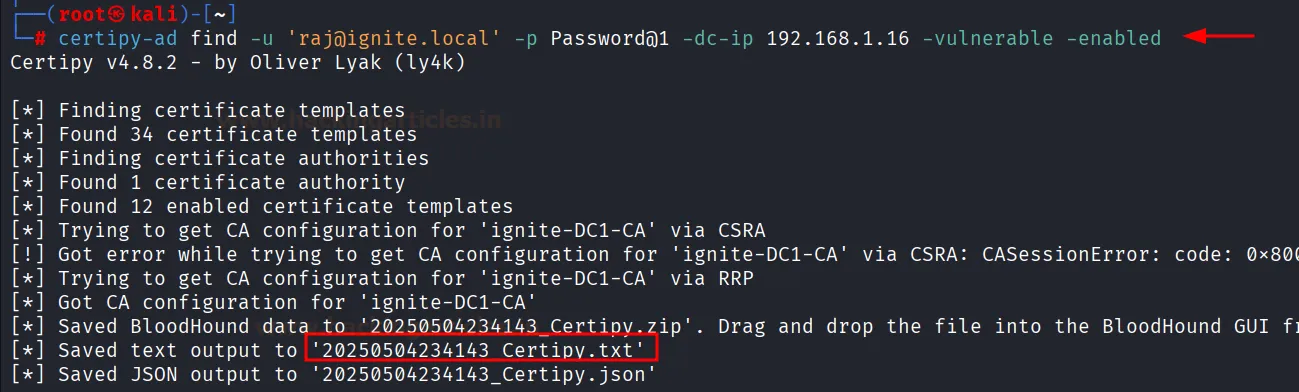 certipy-ad find -u 'raj@ignite. local' -p Password@1 -dc-ip 192.168.1.16 -vulnerable -enabled