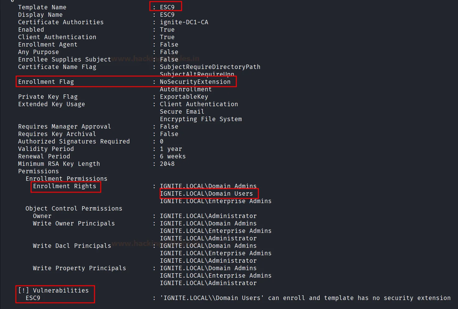 - Vulnerabilities: Явно позначено як ESC9