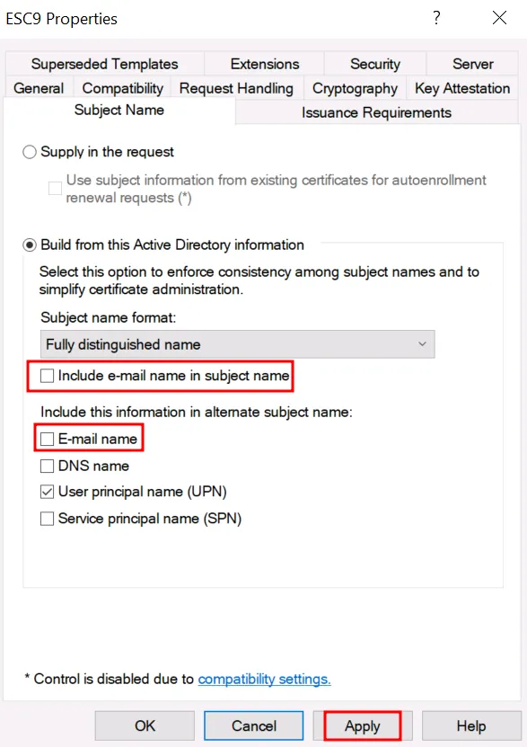 Якщо msPKI-Certificate-Name-Flag = 1 або 3 ТА SAN містить UserPrincipalName, ESC9 можна експлуатувати.