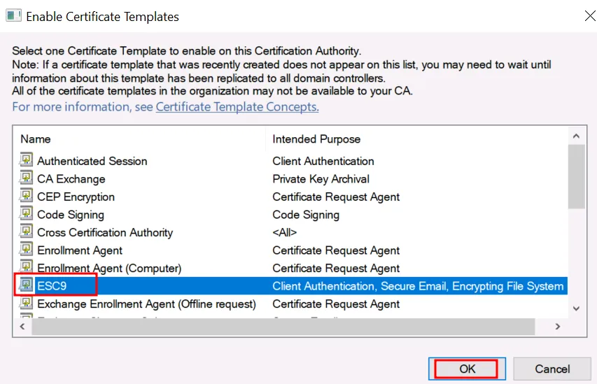 - Виберіть новостворений шаблон ESC9 зі списку.