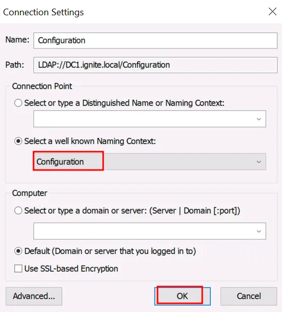 У розділі Select a well known Naming Context виберіть: Configuration