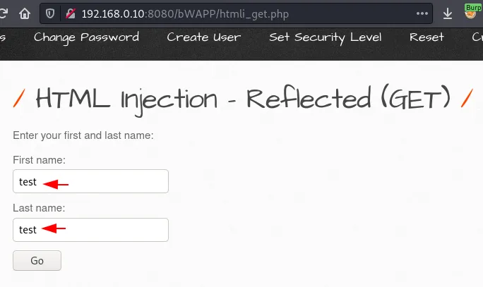 Запустіть додаток bWAPP (логін/пароль bee:bug) і перейдіть на сторінку HTML Injection (Reflected). Далі введіть довільні тестові дані та натисніть кнопку Go, попередньо увімкнувши Proxy Service.