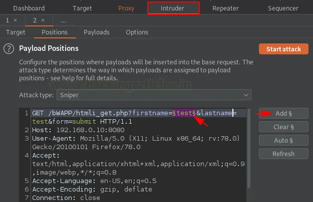 Щойно це зроблено, перейдімо до вкладки Positions у розділі Intruder, щоб встановити точку ін’єкції. Просто очистьте стандартні виділення (кнопка Clear) і додайте те, яке ви хочете, щоб сканер проаудував (кнопка Add).