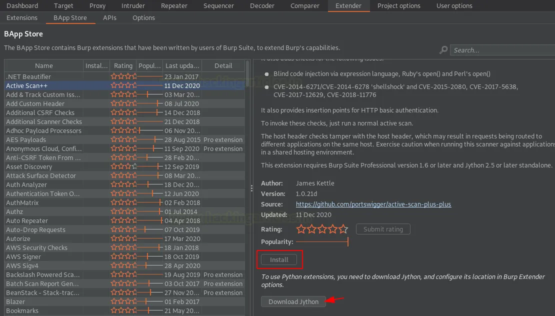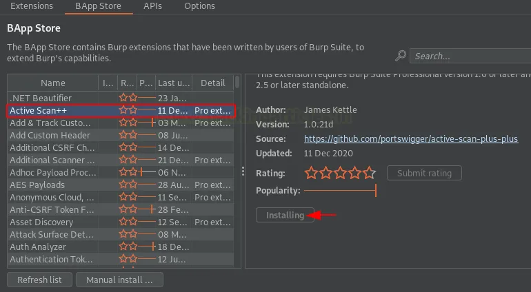 Тепер поверніться до BApp Store і відкрийте праву панель Active Scan++. Як бачите на зображенні нижче, кнопка Install тепер активна — натисніть її, щоб розпочати встановлення.