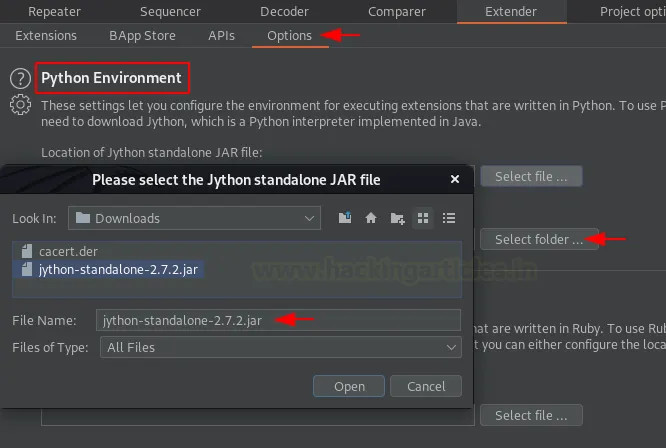 Щойно файл буде збережено на вашому локальному комп’ютері, ми підключимо його до Burp Suite. Поверніться до вкладки Extensions (або Extender), перейдіть у розділ Options і прокрутіть вниз до пункту «Python Environment». Натисніть кнопку Select file і виберіть завантажений файл.