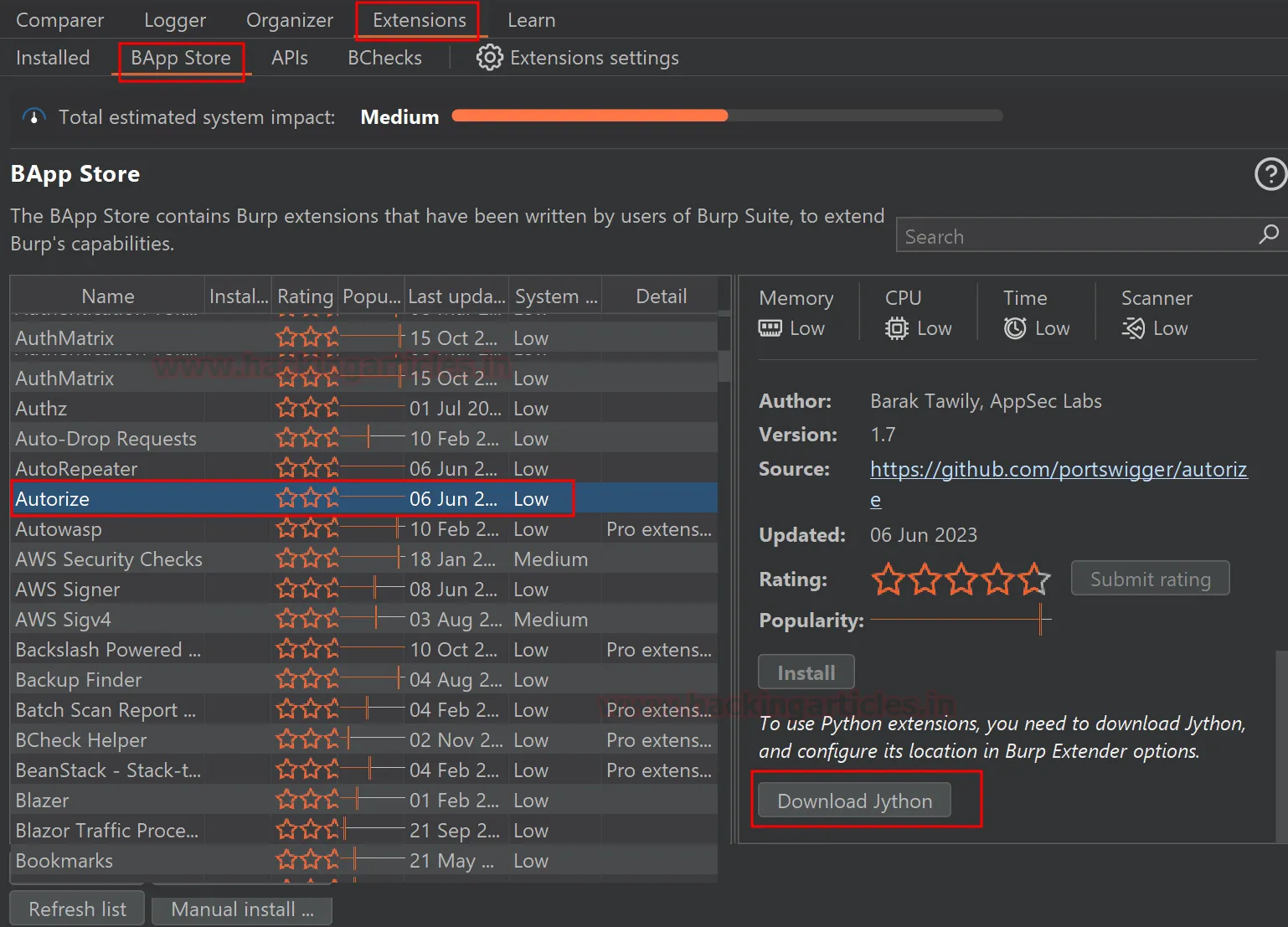 Ви можете завантажити та встановити розширення з BApp Store. Перейдіть у вкладку Extensions, виберіть BApp Store, знайдіть у списку «Autorize» (або скористайтеся пошуком) і натисніть на нього.