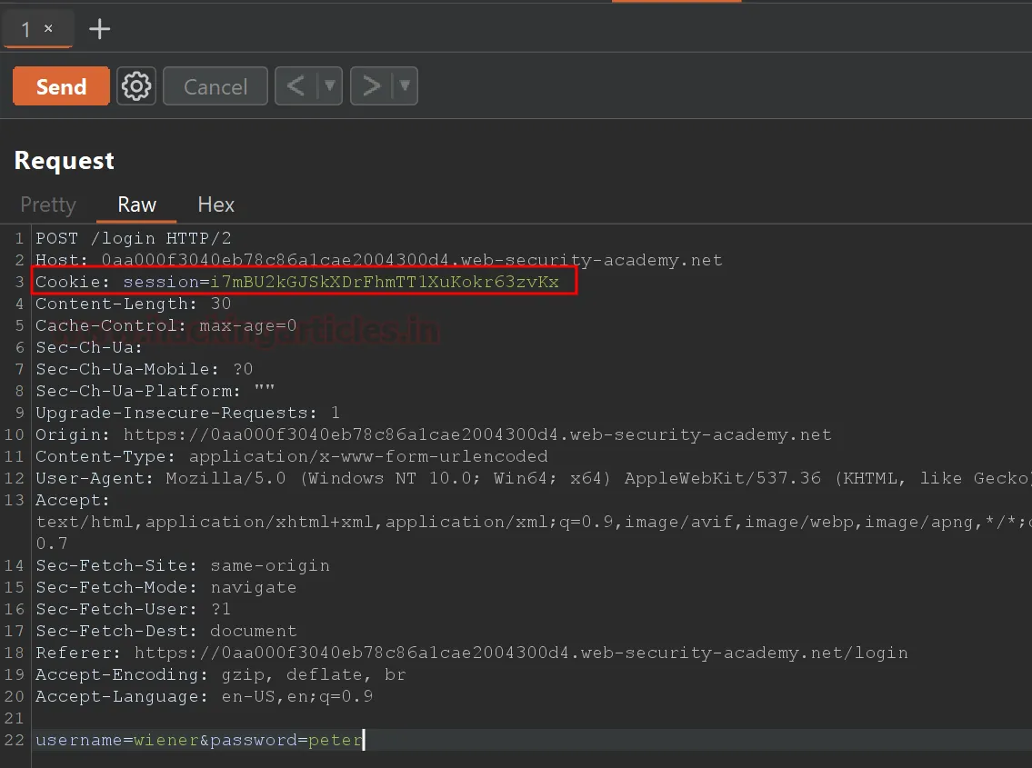 Нижче ви побачите перехоплені сесійні куки (session cookies) у запиті на авторизацію. Скопіюйте цей заголовок Cookie.