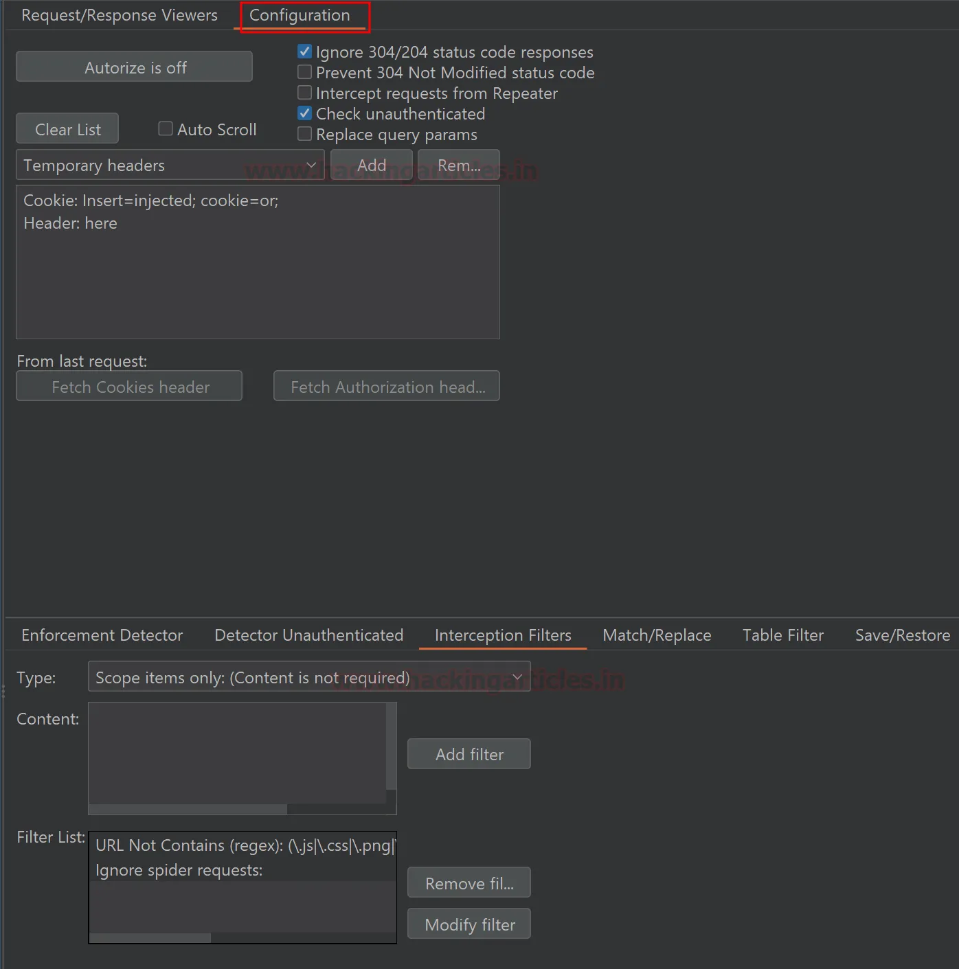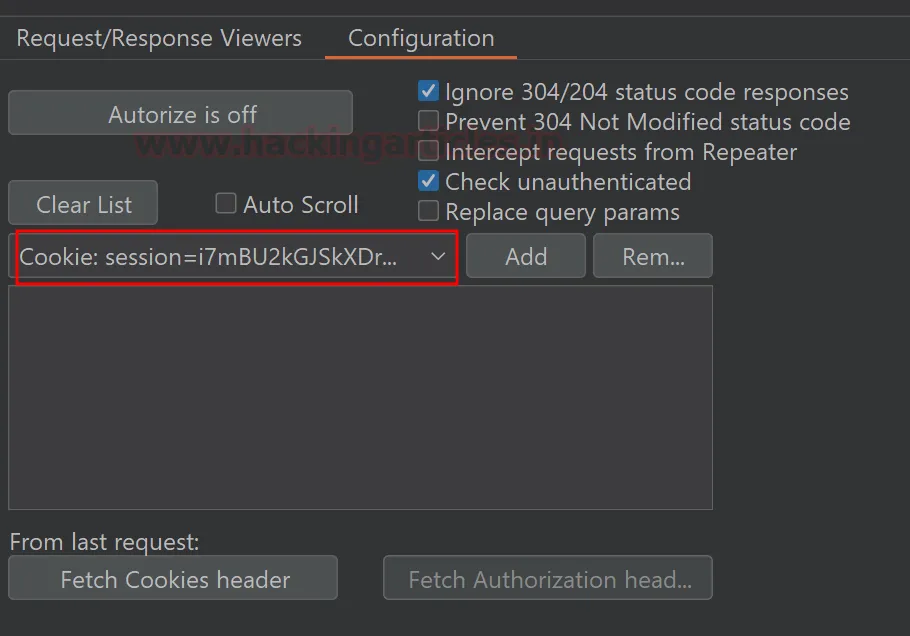 Після завантаження сесійних куків ви маєте вказати Autorize, які саме запити перехоплювати та як виглядає стандартна поведінка додатка при відмові в доступі.