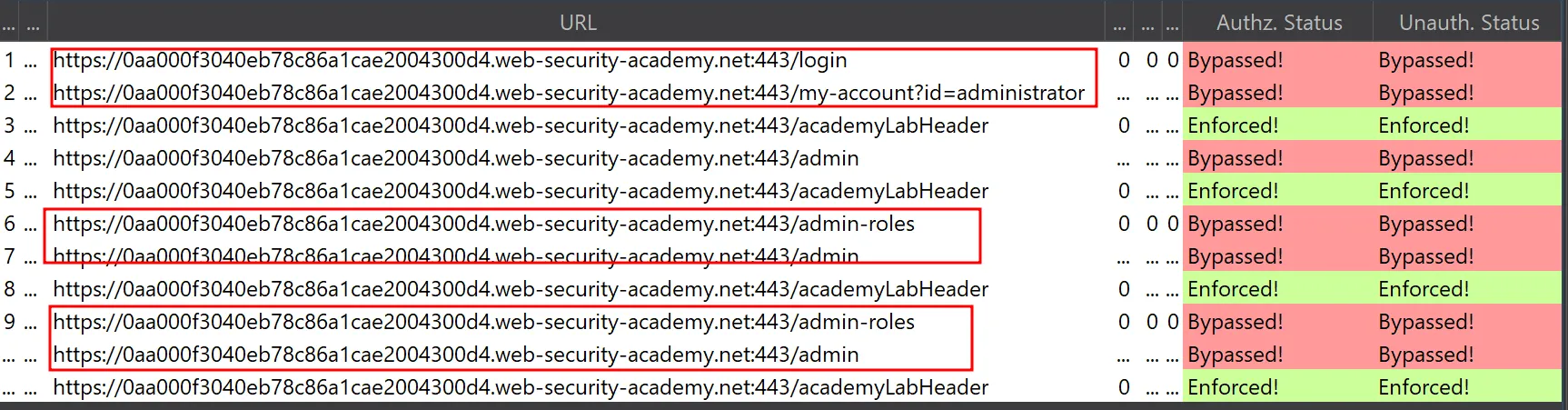 Інші можливі сценарії: Припустимо, ви тестуєте проблеми авторизації між двома користувачами одного рівня. Якщо Authz. Status показує Bypassed!, а Unauth. Status — Enforced!, це свідчить про некоректну авторизацію: другий користувач може отримати доступ до ресурсу першого, хоча для неавторизованих відвідувачів доступ закритий належним чином.