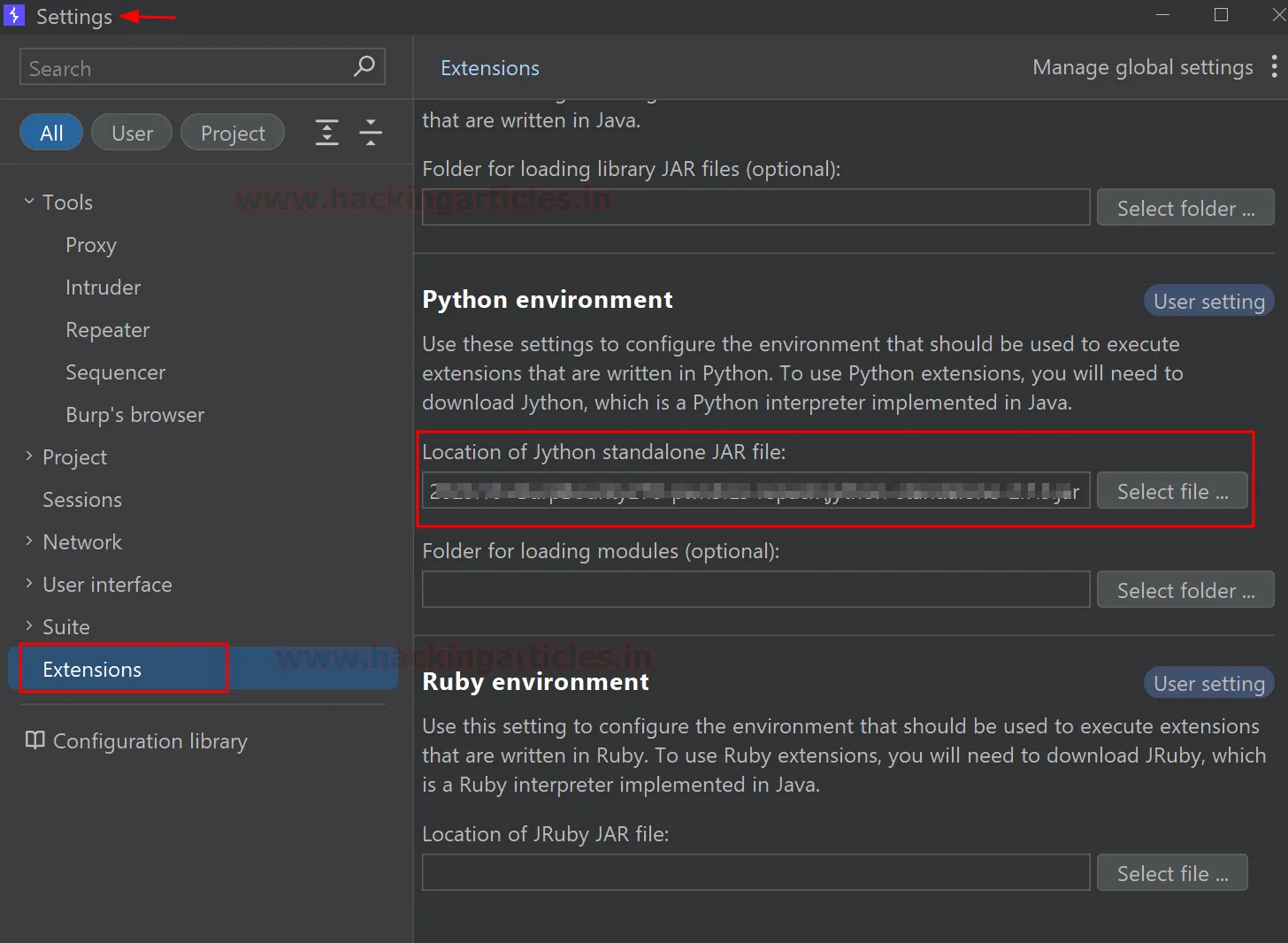 Після завантаження перейдіть у Settings > Extensions. У розділі Python Environment вкажіть шлях до завантаженого файлу Jython. Після цього середовище Python буде успішно налаштовано.