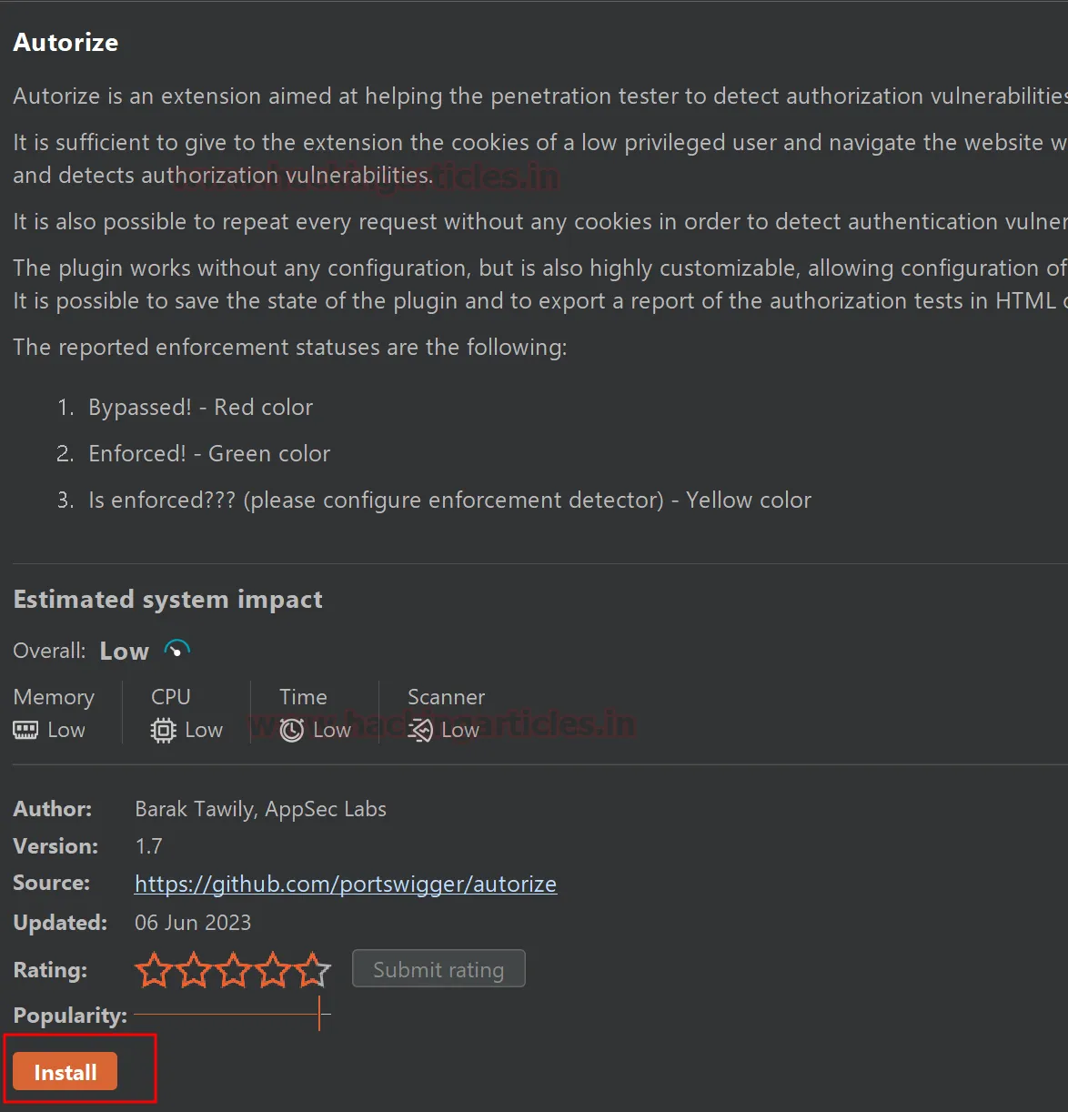 Перезапустіть Burp Suite, поверніться до BApp Store та встановіть Autorize (кнопка Install тепер буде активною).