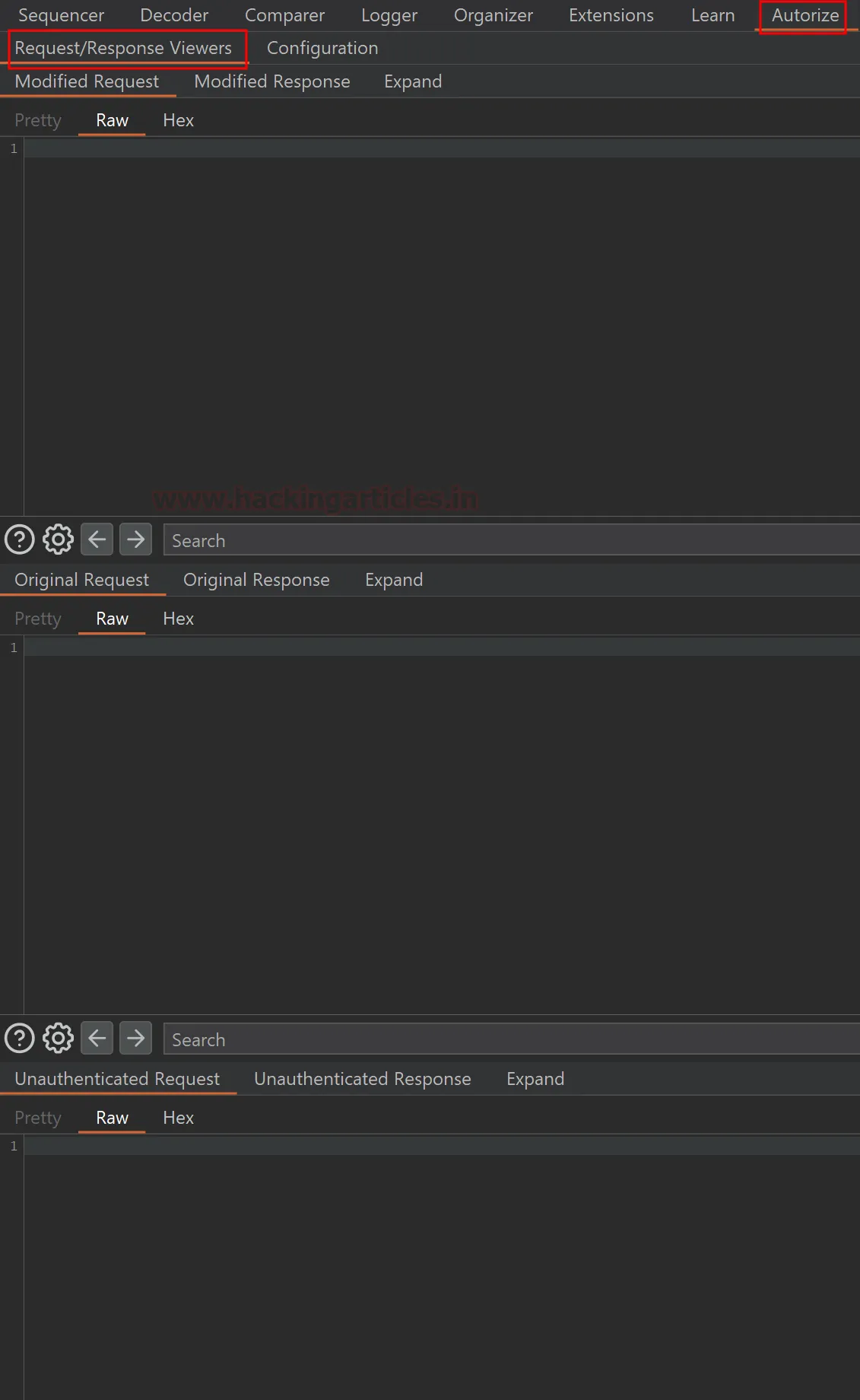 Розділ Autorize містить дві основні вкладки: Request/Response Viewers та Configuration.