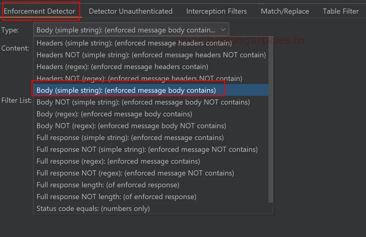 У розділі Enforcement Detector введіть ознаку відповіді (характеристику), яку видає система при недостатніх привілеях користувача. Найпростіший варіант — вибрати «Body (simple string): enforced message body contains» та вказати текст помилки (наприклад, “Access Denied”).