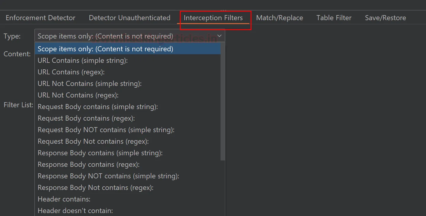 Фільтр перехоплення за замовчуванням обробляє лише елементи в межах області тестування (Scope items only) та ігнорує запити від павука (spider) або URL-адреси з розширеннями зображень. Ви можете налаштувати ці фільтри під свої потреби.