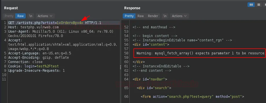 Почнемо з test.vulnweb: увійдемо в систему та перевіримо список артистів (artists).