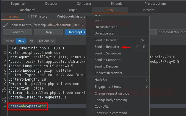 Після того, як запит буде перехоплений Burp Suite, просто передайте його в Repeater.